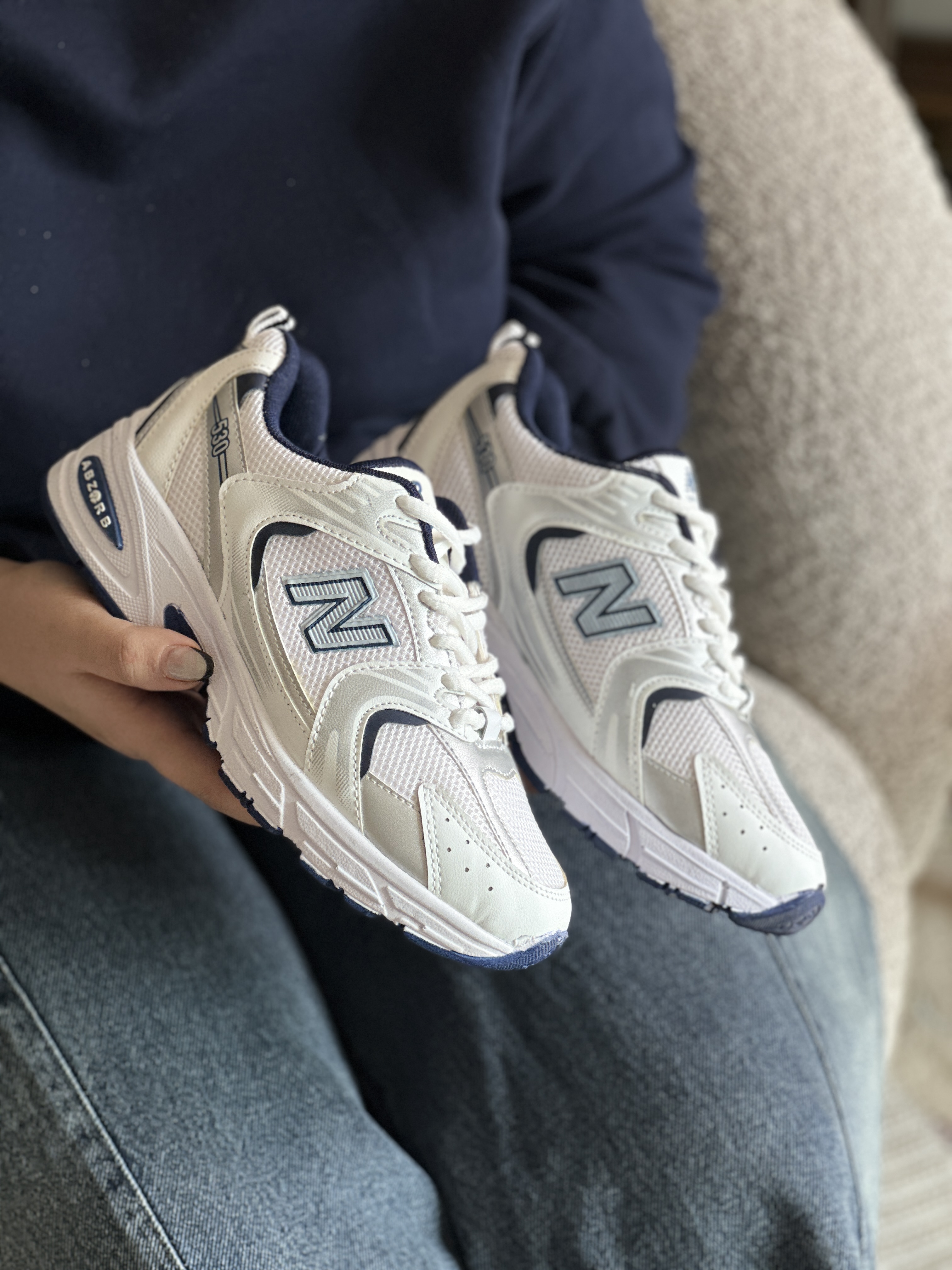 کفش کتانی زنانه طرح نیوبالانس۵۳۰سفید سرمه ای | مناسب ورزش، پیاده‌روی و استفاده روزمره