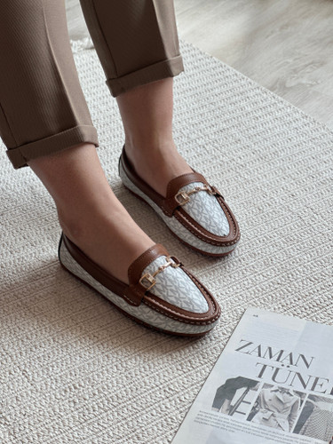 کفش کالج راحتی زنانه طرح مونوگرام کرم قهوهای با یراق فلزی